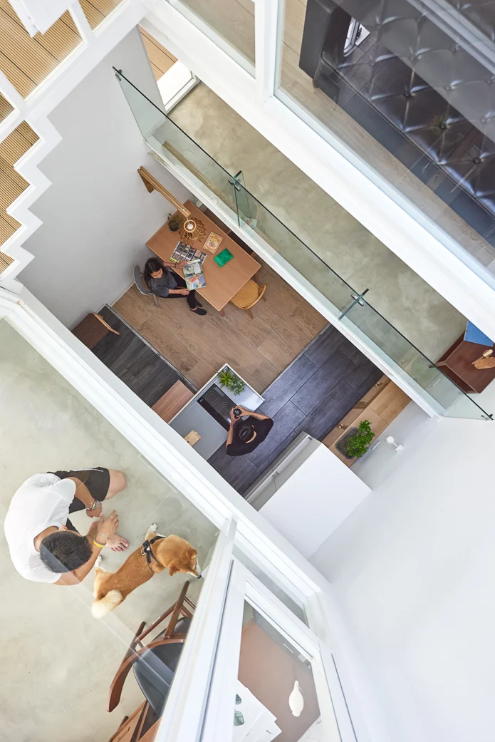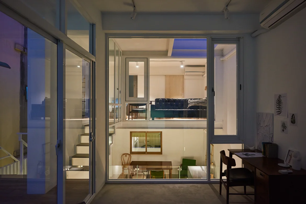 This project is a multipurpose space that combines a studio and exhibition space featuring furniture for sale. The property, a unit in a row of old townhouses, is located in Kaohsiung City's Zuoying District. The 36 year-old house has a retro, warm and inviting exterior and retains the split-level floor plan popular in the 1960s. Past occupants have made additions according to their needs, including a sheet metal shack and windows with iron grating.