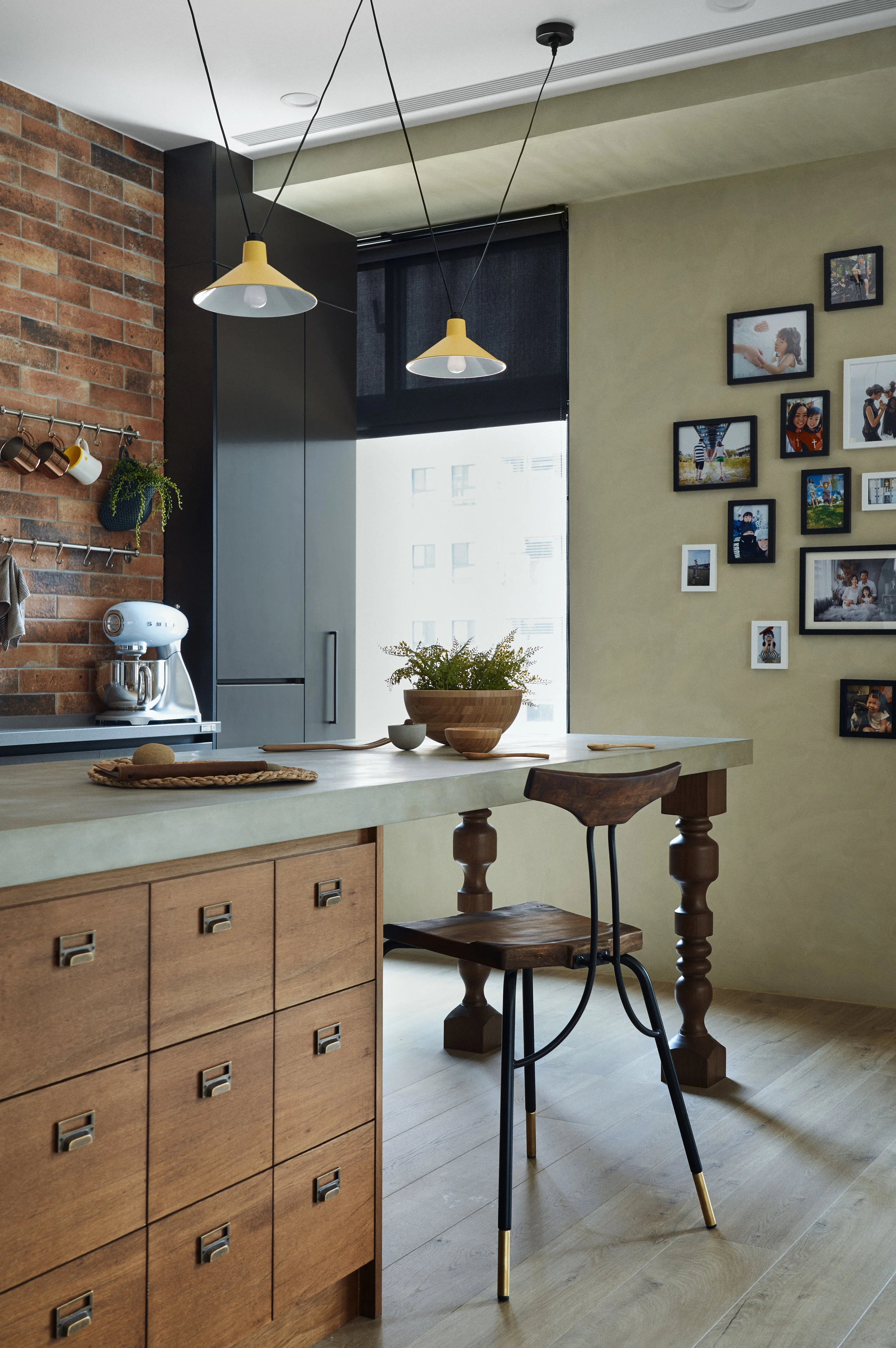 原主臥室有偌大陽台,改挪作客廳,讓交流活動頻繁的公共空間享有充沛採光。 紅磚牆與木頭材質皆採仿舊處理,悠閒鄉村氣息油然而生,再搭配線條簡潔、鑲嵌個性金屬的傢俱與燈飾,協調出摩登現代性。原晦暗擁擠的廚房則改為主臥室, 並模擬歐洲廣場在陽台砌築一道大型圓拱磚牆,寫下時空跳躍意象,搭配的白色紗簾柔軟輕盈、如夢似幻,增進紓壓效果。